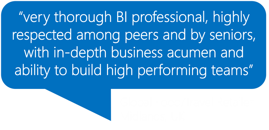 __SSP Food & Travel Experts (Birmingham, UK)__Managing a team of 20+ developers, solution architects and testers for a global MSBI solution handling over 1m customer transactions every day. Introducing new BI governance and data & solution improvement programmes.[Dave from POB Enterprises was...] "a very thorough BI professional, highly respected among peers and by seniors, with in-depth business acumen and ability to build high performing teams "